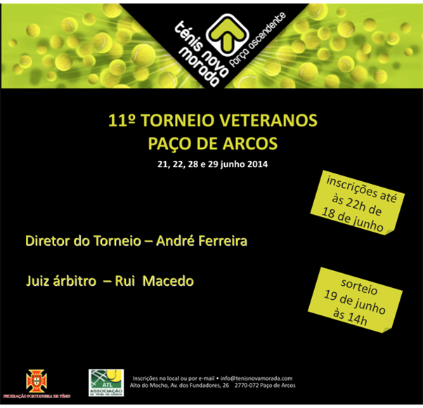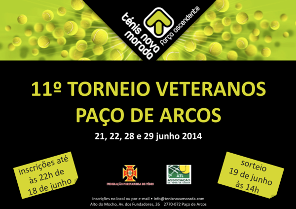 Nos fins de semana de 21/22 e 28/29 de Junho de 2014 irá ser realizado o 11º Torneio Veteranos Paço de Arcos que se realizará no Centro de Ténis Nova Morada.